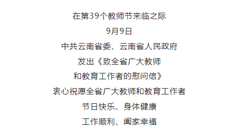 在第39个教师节来临之际9月9日中共云南省委、云南省人民政府发出《致全省广大教师和教育工作者的慰问信》衷心祝愿全省广大教师和教育工作者节日快乐、身体健康工作顺利、阖家幸福全文如下↓↓全省广大教师和教育工作者:在...