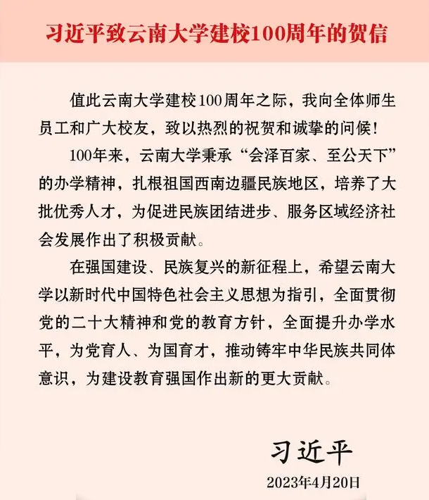 新华社北京4月20日电中共中央总书记、国家主席、中央军委主席习近平20日致信祝贺云南大学建校100周年,向全体师生员工和广大校友致以热烈的祝贺和诚挚的问候。习近平在贺信中指出,100年来,云南大学秉承“会泽百家...