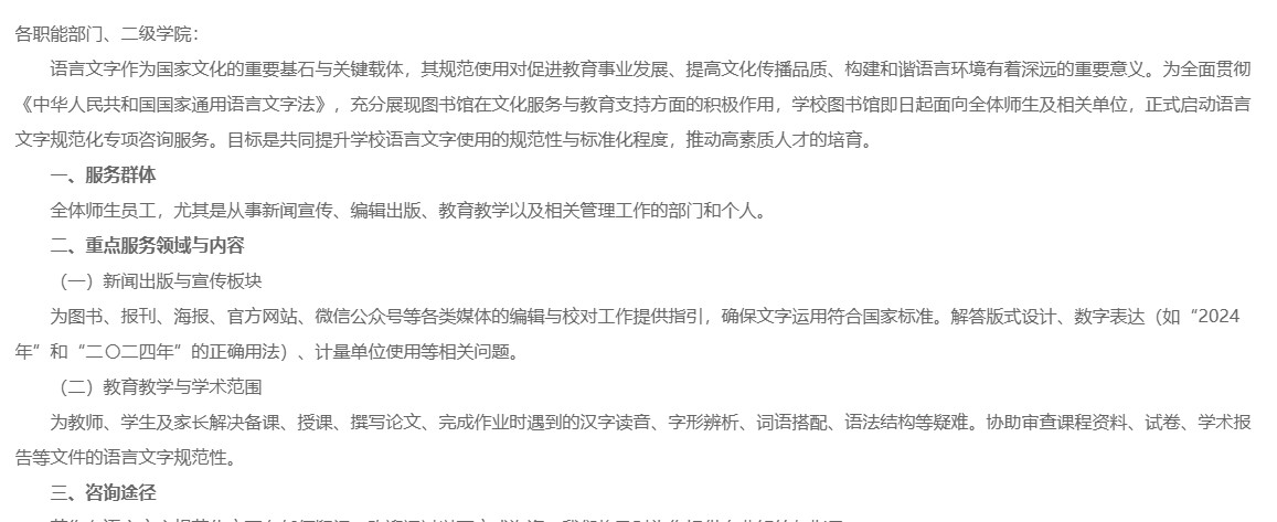 各职能部门、二级学院:语言文字作为国家文化的重要基石与关键载体,其规范使用对促进教育事业发展、提高文化传播品质、构建和谐语言环境有着深远的重要意义。为全面贯彻《中华人民共和国国家通用语言文字法》,充分展现图书馆...