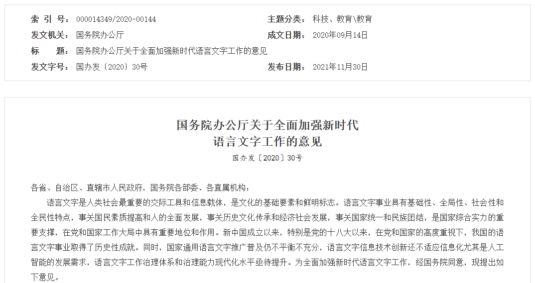 各省、自治区、直辖市人民政府,国务院各部委、各直属机构:语言文字是人类社会最重要的交际工具和信息载体,是文化的基础要素和鲜明标志。语言文字事业具有基础性、全局性、社会性和全民性特点,事关国民素质提高和人的全面发...