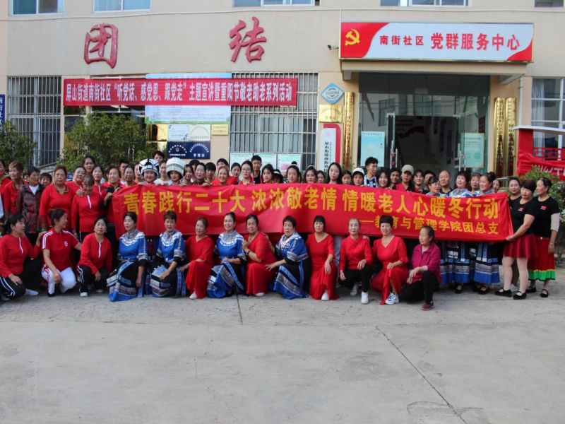为弘扬和传承中华民族传统孝道,庆祝重阳节的到来,10月23日下午,教育与管理学院进禄劝县南街社区开展了以“青春践行浓浓敬老情情暖老人心暖冬行动”为主题的重阳节活动。教育与管理学院大学生志愿者表演队,各村委会表演...