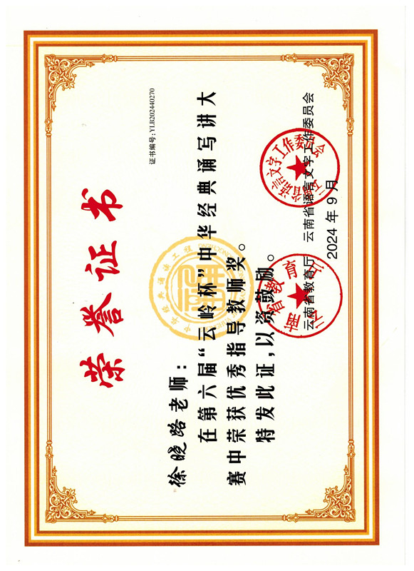2024年5月sunbet申搏官方网站心理咨询中心按照云南省语言文字工作委员会、云南省教育厅《关于举办云南省第六届“云岭杯”中华经典诵写讲大赛的通知》要求,组织中华经典诵写讲大赛校赛,并将表现突出的4名校赛优秀选手推荐参加三个赛项四个组别的省赛。近日,收到云南省语言文字工作委员会 云南省教育厅关于公布第六届“云岭杯”中华经典诵写讲大赛比赛结果的通知,学校推荐作品全部获奖,共获奖6项,分别为:一等奖1项、二等奖3项、三等奖1项、优秀指导教师奖1项。获奖情况如下: