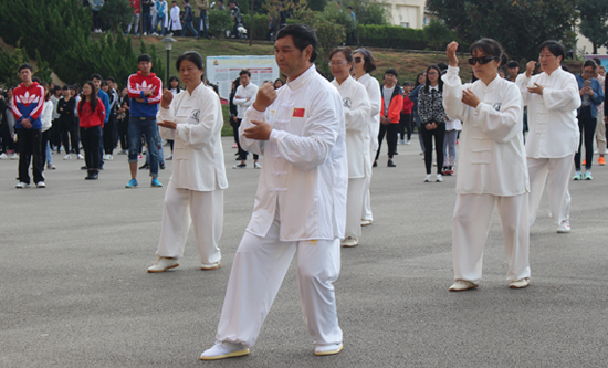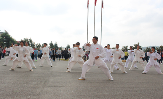这一行专家到校后就积极的开始热身、练习,到了我们做课间操打太极的时候,专家们就给我们做了相应的表演,他们的领队人和我们学院的关院长亲自发表了讲话,对我们学院太极拳的发展给以了充分的肯定,也对我们学院太极拳的发展提出了几点希望,后太极拳专家对就主动深入班级表演给我们的学生看,太极拳专家队的