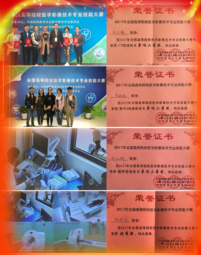 2017年4月23日—25日学院医学康复系学生参加全国高等院校医学影像技术专业技能大赛(大赛的主办方是中国高等教育学会医学教育专业委员会,全国卫生职业教育教学指导委员会,协办单位是中华医学影像技术分会,承办单位是上海健康医学院。) 参赛选手荣获:CT组二等奖1名(祁文静)、DR组二等奖1名(张鹏程)、超声组三等奖1名(何礼娇)、诊断组优秀奖1名(扬程志)。