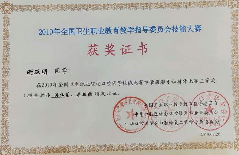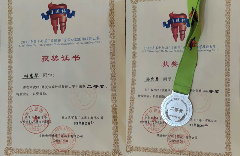 本次大赛于2019年7月20日在山东省枣庄职业学院举行,参赛选手分别来自全国76所本科、高职大专、中专院校,共计196人参加比赛。在学院各位领导的大力支持、指导教师的精心教导、参赛选手的辛苦付出下,sunbet申搏谢跃明同学荣获雕牙和排牙比赛三等奖,游忠琴同学荣获CAD修复体设计组技能大赛二等奖。