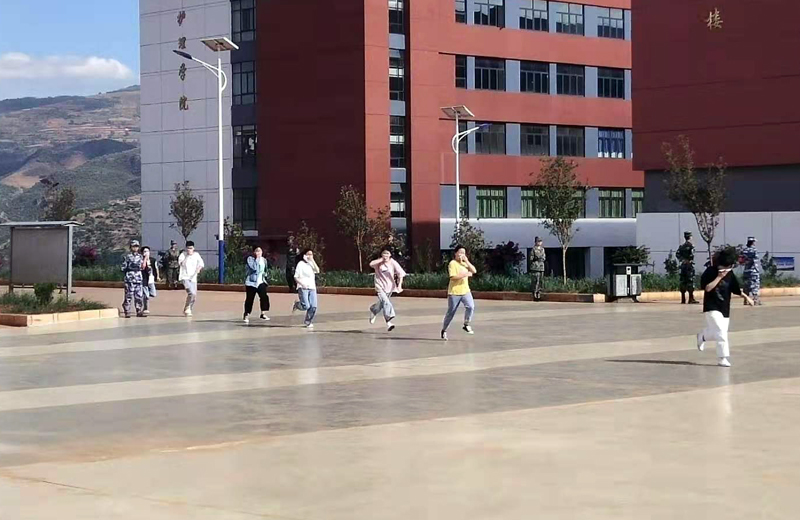 下午4时40分,李艳梅副院长宣布演练开始,随着警报声响起,同学们弯着腰,用湿纸巾或衣袖捂着嘴鼻,迅速的撤离,奔向安全地点。整个过程一气呵成,第三教学楼18个教学班的1200名学生,从教室有序撒离到安全的操场中心,仅用了3分08秒,使这次演练得了圆满的成功。所有人集合完毕后,李艳梅副院长指示清点人数,由各个班级辅导员清点人数,再由胡副部长统计总人数后上报李艳梅副院长。
