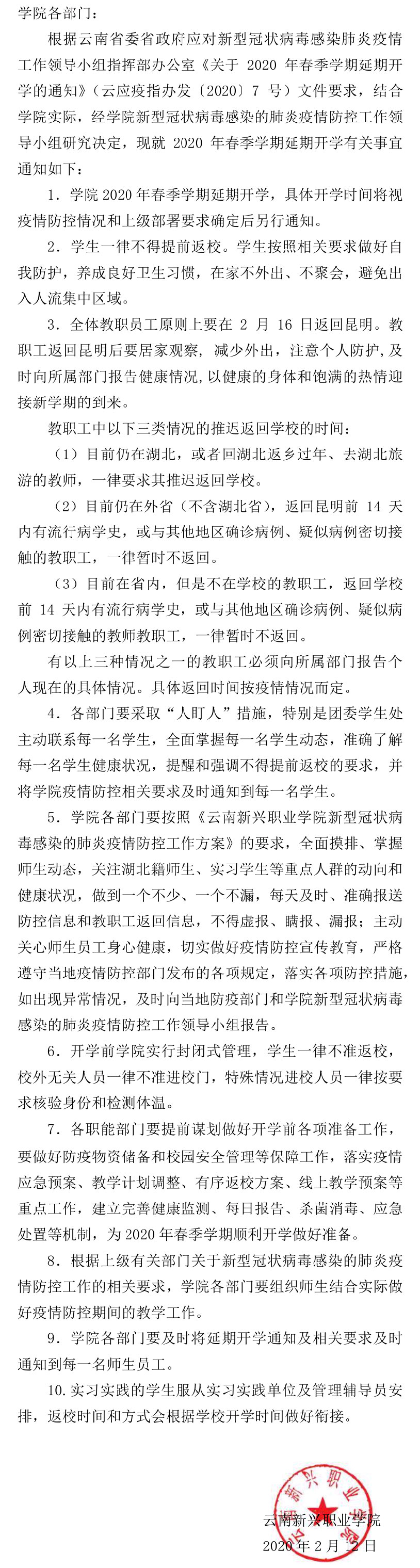 sunbet申搏官方网站关于2020年春季学期延期开学的通知