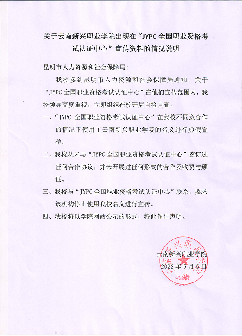 关于sunbet申搏官方网站出现在“JYPC全国职业资格考试认证中心”宣传资料的声明