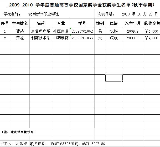 2009-2010学年度普通高等学校省政府励志奖学金获奖学生名单(秋季学期)