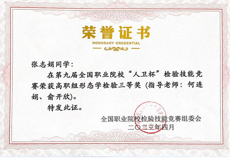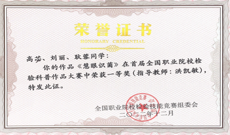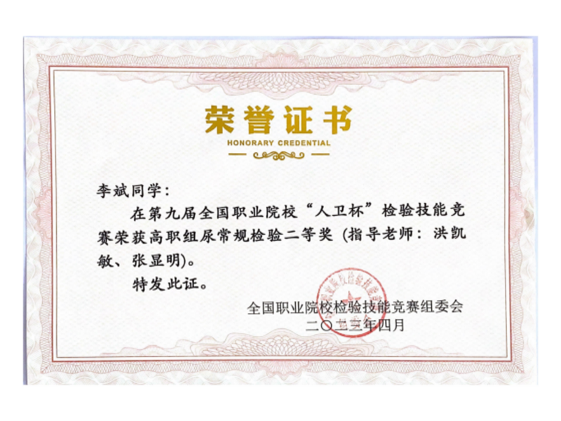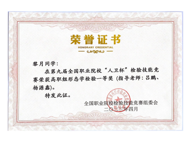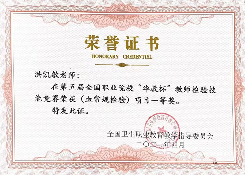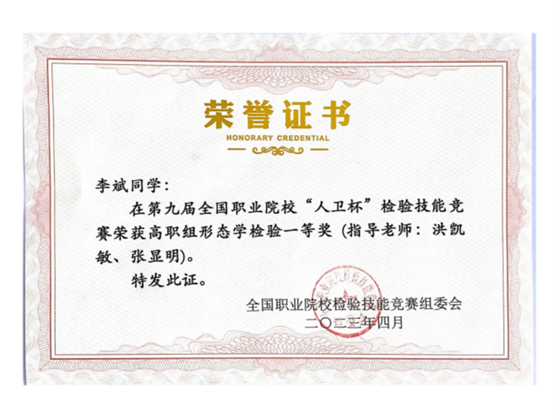 2021年sunbet申搏医学检验技术专业教师洪凯敏、张显明、何连娟、杨源鑫参加第五届“华教杯”全国职业院校教师检验技能竞赛,分别荣获一等奖、三等奖以及优秀奖;2022年sunbet申搏医学检验技术专业学生参加全国职业院校首届检验科普作品大赛荣获一等奖1项,二等奖1项,三等奖7项;2022年sunbet申搏官方网站教师莫馨霈、杨炳金、洪凯敏、何连娟、晏荣蓉老师参加首届全国职业院校检验专业课程思政大赛中荣获二等奖;2023年医学检验技术专业在全国职业院校教师检验技能大赛荣获一等奖1项,二等奖1项,三等奖3项;